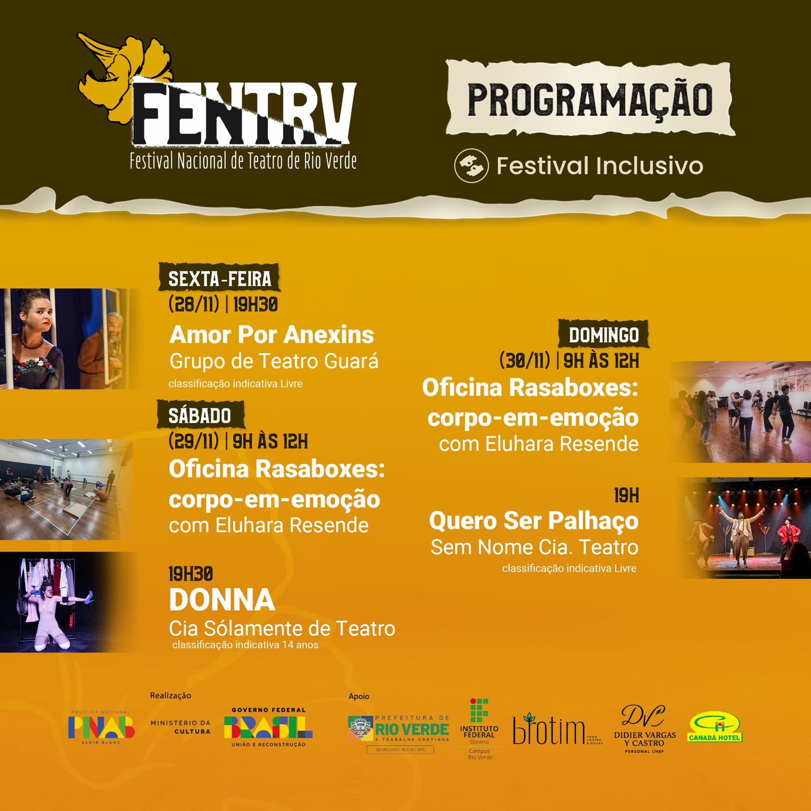 A programação se estende pelos três dias de Festival. Na sexta-feira (28/11), às 19h30, o Grupo de Teatro Guará abre o evento com o espetáculo “Amor Por Anexins”, com classificação livre. No sábado (29/11), das 9h às 12h, acontece a oficina Rasaboxes: corpo-em-emoção, ministrada por Eluhara Resende. Às 19h30, o palco recebe o espetáculo “DONNA”, da Cia SóLamente de Teatro, indicado para maiores de 14 anos. No domingo (30/11), das 9h às 12h, a oficina retorna com Eluhara Resende, e o encerramento será às 19h, com o espetáculo “Quero Ser Palhaço”, da Sem Nome Cia. Teatro, aberto para toda a família. Todas as apresentações contarão com intérprete de Libras.