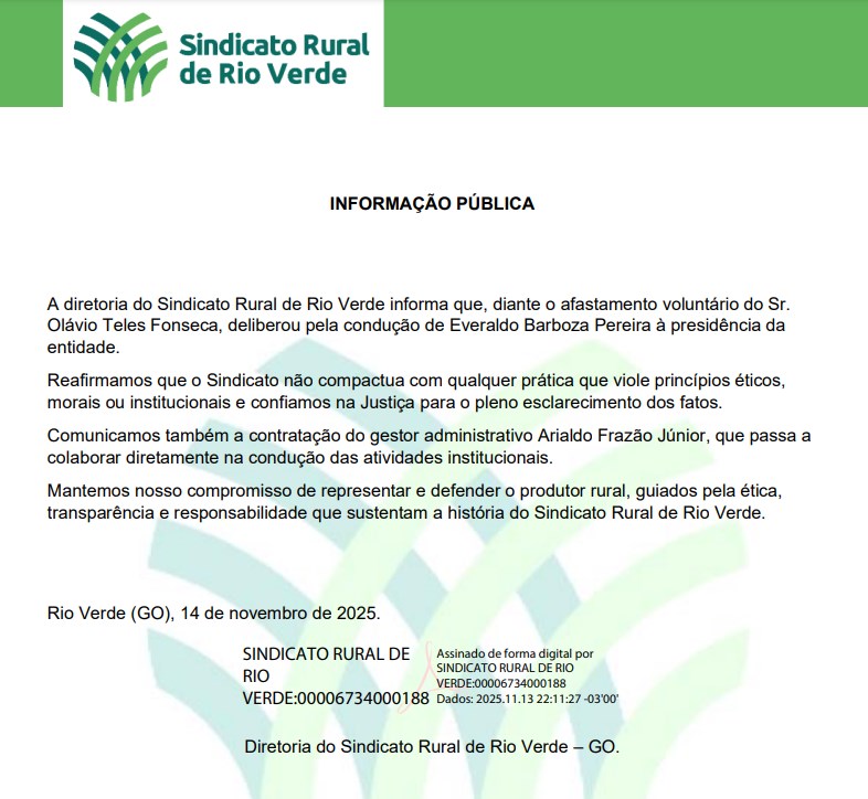 O Sindicato Rural de Rio Verde divulgou, nesta sexta-feira (14), uma nova nota oficial comunicando mudanças na direção da entidade após o afastamento voluntário do então presidente, Olávio Teles Fonseca, que deixou o cargo para o andamento das investigações da Polícia Civil.