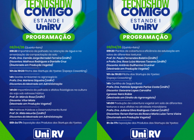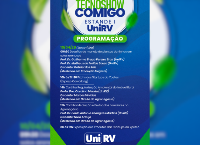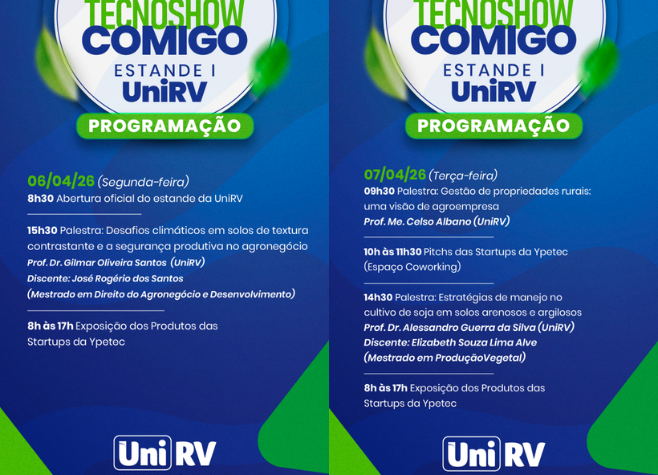 Com a aproximação da Tecnoshow 2026, que começa na próxima segunda-feira (6), a Universidade de Rio Verde (UniRV) finaliza os preparativos para marcar presença no evento com uma programação voltada à inovação e ao desenvolvimento do agronegócio.